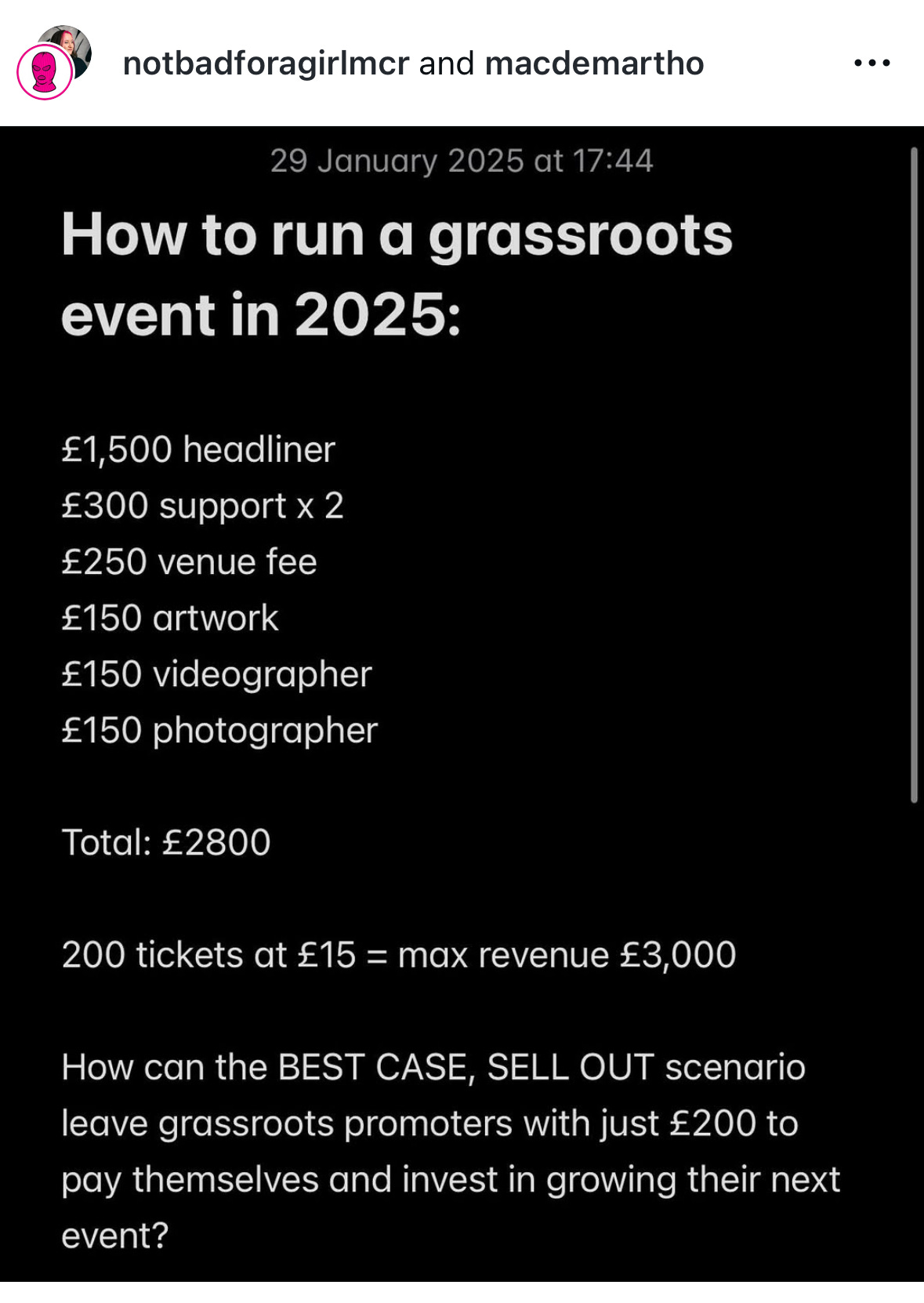 If your social feeds are anything like mine, then you might have seen this mildly viral Instagram post from the other week, in which Manchester-based promoters Not Bad For A Girl break down the financial challenges they face putting on parties: