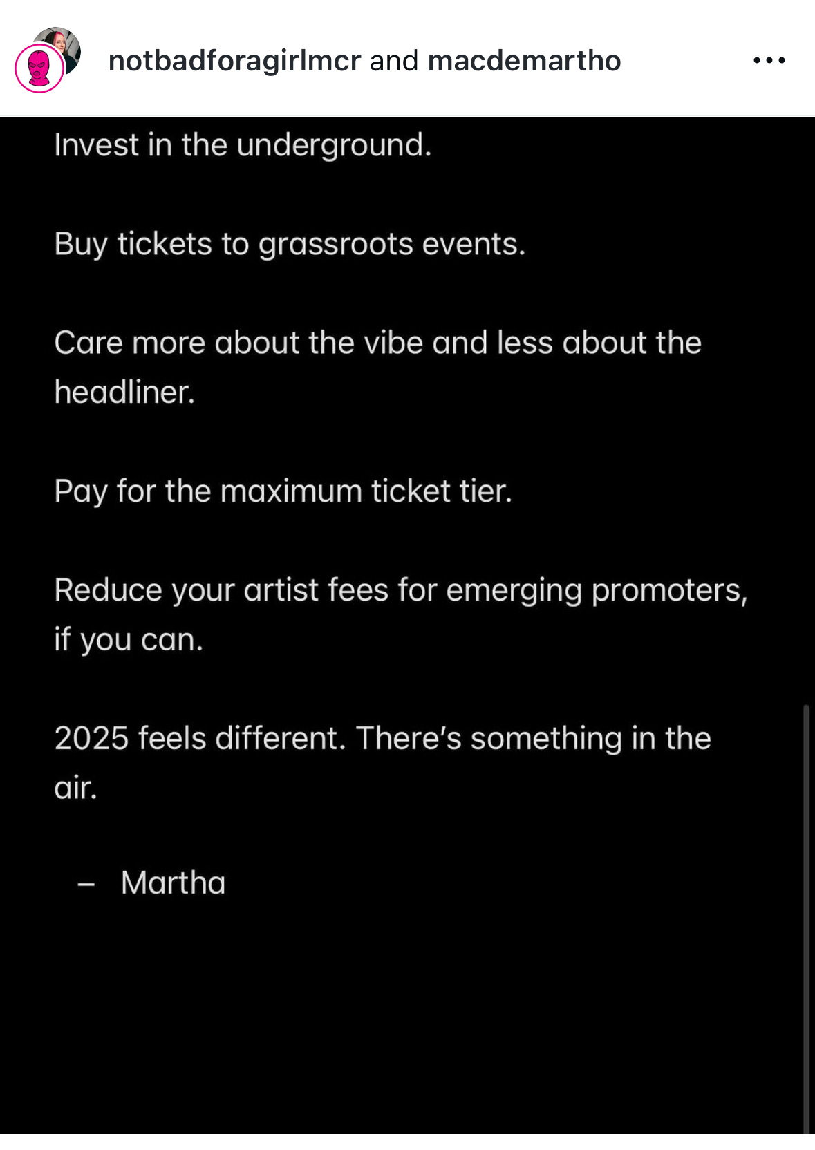 I’m always a fan of people being more transparent about the practical and economic realities of their work, and the diagnosis here is clear and inarguable: the music industry is now so irredeemably broken that even a successful promoter selling out a venue isn’t enough to make the numbers work. This obviously isn’t a new problem, or specific to Not Bad For A Girl, but seeing it laid out in such stark terms is powerful.