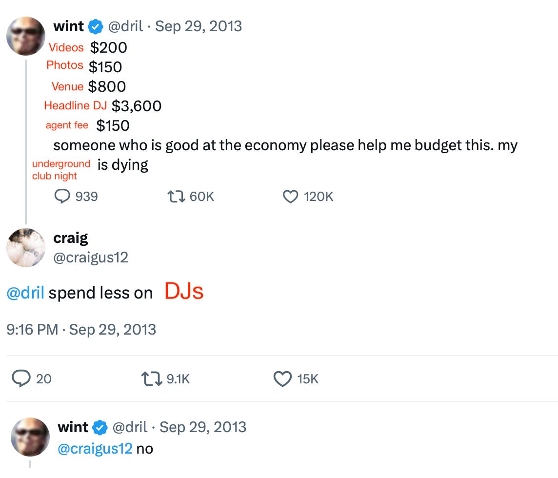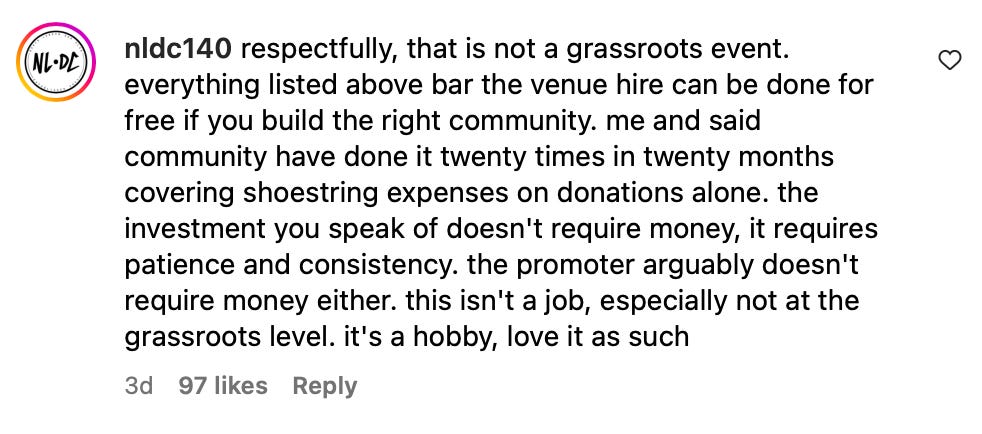 There’s a third category of comments under NBFAG’s post which could be broadly defined as existential: questioning whether the specific business model outlined in their breakdown, with its four-figure DJ fees for tiny venues and endless churn of digital marketing content, is even worth protecting in the first place.